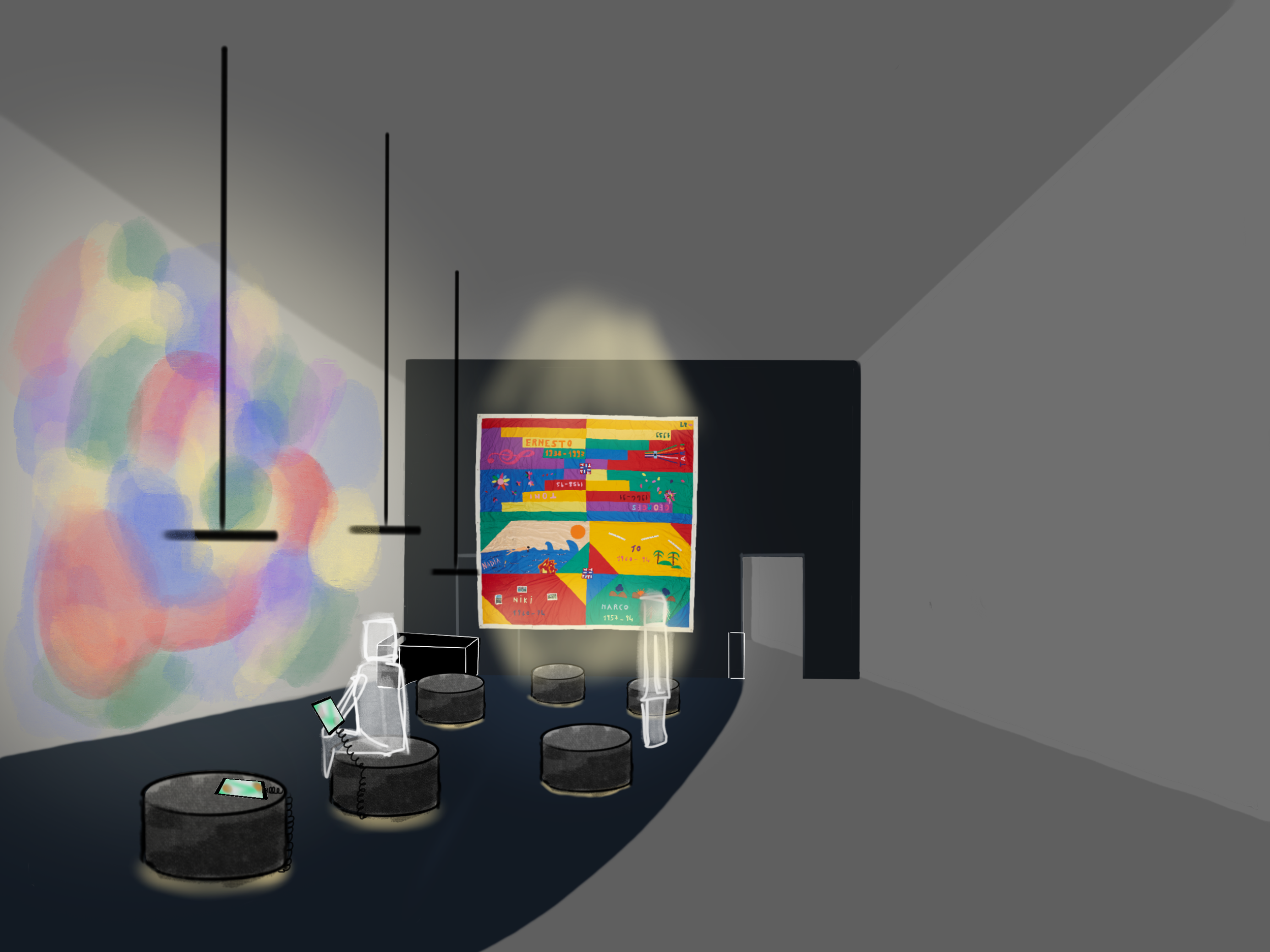 Ich entwickelte ein Ausstellungskonzept zum Thema Erinnerung im Kontext von Aids, mit dem Quilt Nr. 14 als zentralem Exponat. Ziel war es, einen Raum zu gestalten, der sowohl würdigt als auch berührt. Dafür konzipierte ich eine abgedunkelte, klar strukturierte Rauminszenierung mit interaktiven Elementen: einer immersiven Lichtprojektion, fokussierten Klangstationen und Sitzhockern mit Tablets. Besucher*innen können persönliche Geschichten, Gedichte und historische Hintergründe auswählen, die sich in Bild, Ton und Projektion widerspiegeln. Die Gestaltung entstand durch Skizzen, Moodboards, 3D-Modellbau in Cinema 4D, Animation in After Effects und KI-unterstützte Mockups. Das Ergebnis ist ein multisensorisches Ausstellungserlebnis, das Erinnerung, Interaktion und ästhetische Gestaltung verbindet.