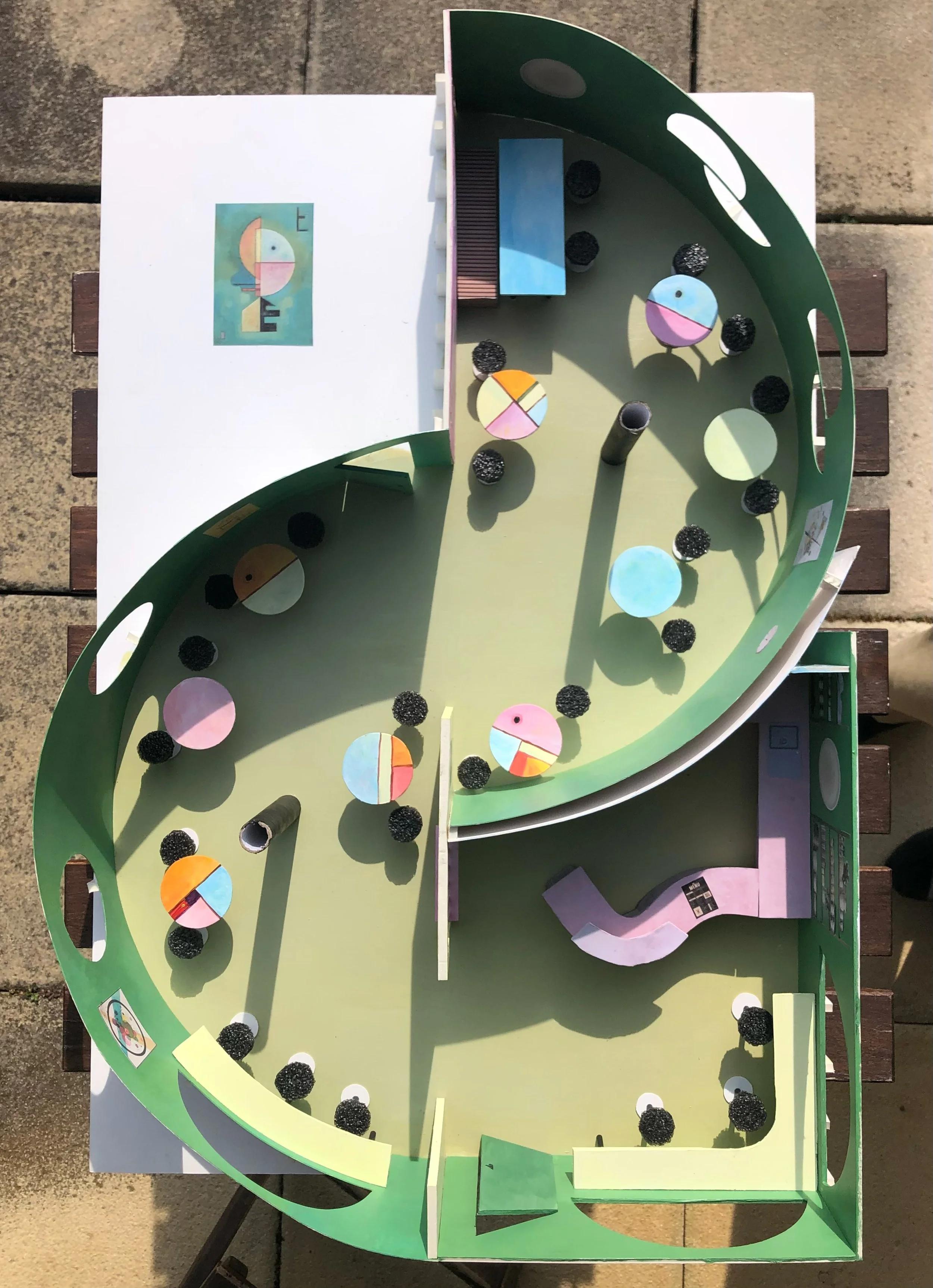 Als Ergebnis entstand ein potenzielles Kaffee mit passendem Inventar. Um etwas Greifbares zu schaffen, baute ich den Raum aus Kunststoffplatten, bemalte ihn und fotografierte ihn anschliessend.